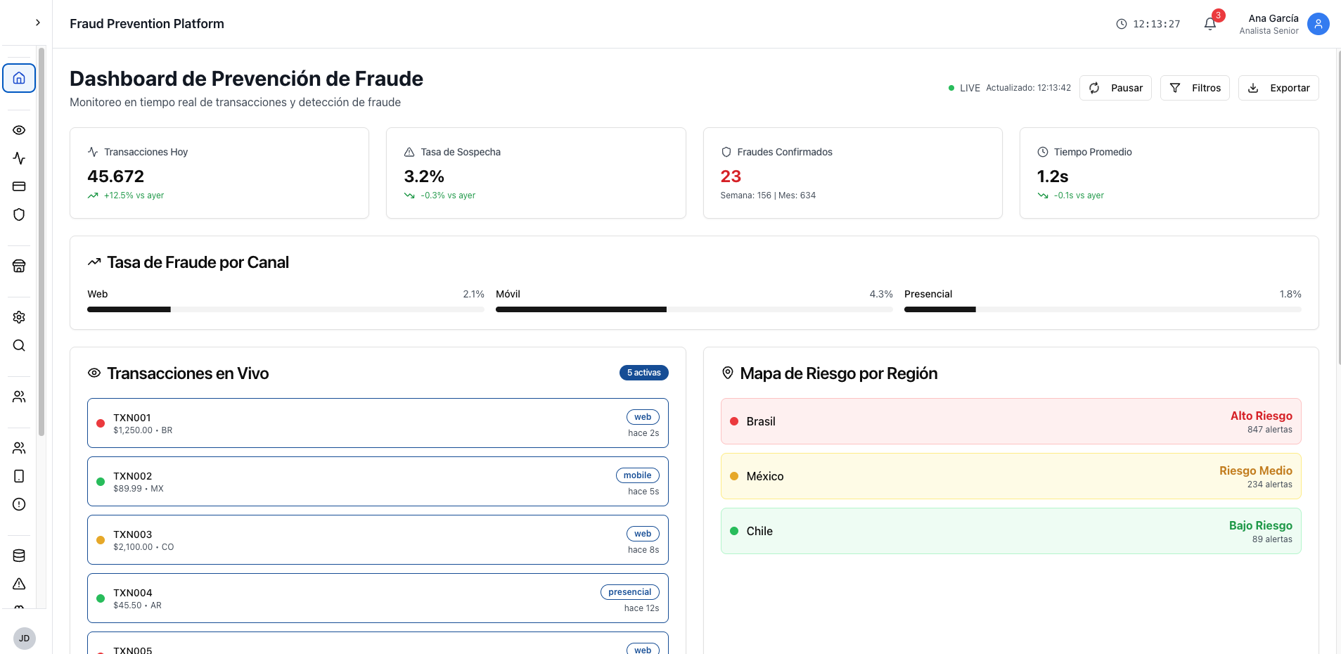 Además del análisis de comportamiento, nuestra solución antifraude para el sector bancario incorpora una capa adicional de protección centrada en la prevención del blanqueo de capitales (AML). Monitoreamos continuamente las cuentas de sus clientes, utilizando motores de reglas y modelos estadísticos para identificar actividades sospechosas.